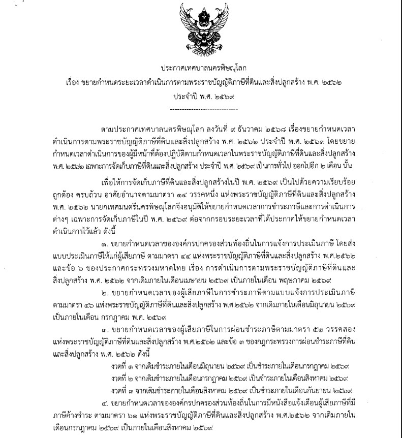 ประกาศเทศบาลนครพิษณุโลก เรื่อง ขยายกำหนดระยะเวลาดำเนินการตามพระราชบัญญัติภาษีที่ดินและสิ่งปลูกสร้าง พ.ศ.2562 ประจำปี พ.ศ.2569